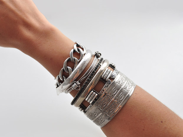 100% prata: combinei peças que tinham a mesmo banho, ou seja: prateado. Usei alguns braceletes para dar estrutura e adicionei correntes para dar maleabilidade. Aqui poderia entrar um relógio prateado tranquilamente.