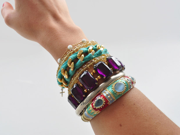 Mix ousado: Quis fazer uma mistura mais ousada, combinando peças bem marcantes com outras mais singelas. As peças lisas servem para amenizar o visual, deixando a atenção para os pontos fortes de cor e tamanho das duas últimas pulseiras.